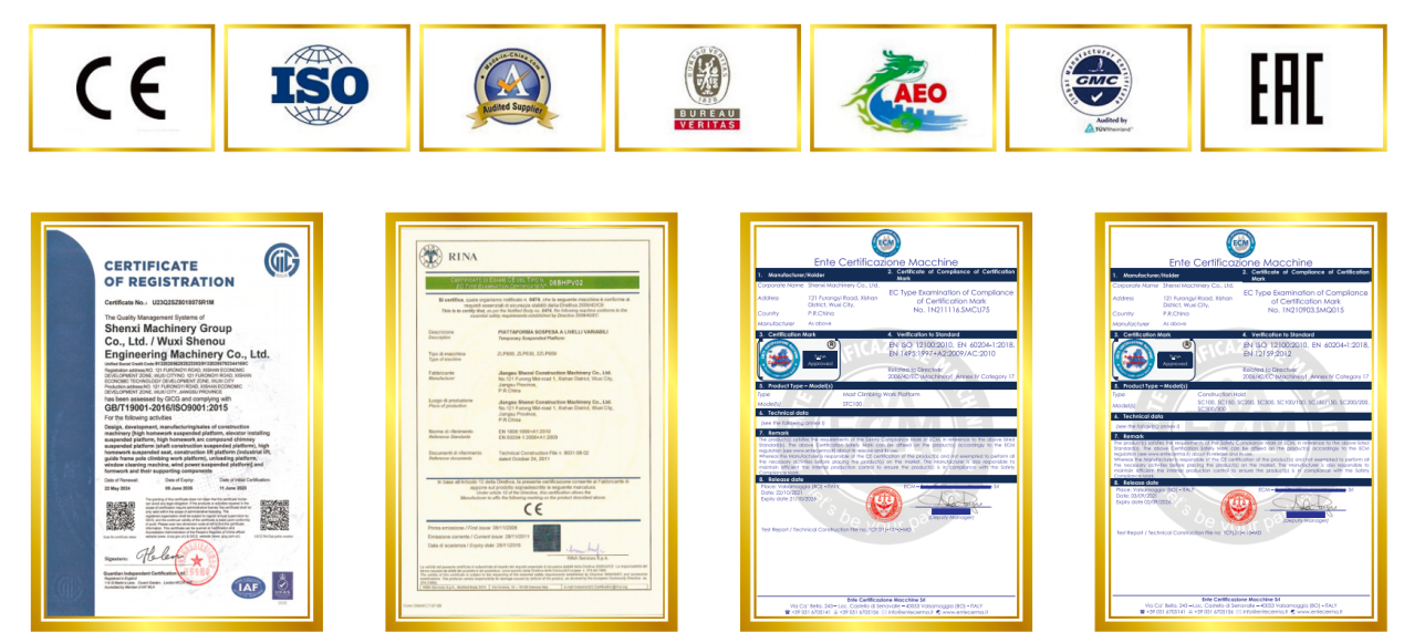 International authoritative certifications: The entire series has passed global certifications such as CE, TUV, ISO, and ANSI, complying with national standards for "High-Altitude Work Suspended Platforms" and "Lifting Work Platforms," and supported by European welding process standards, with a safety factor 15% higher than industry standards;